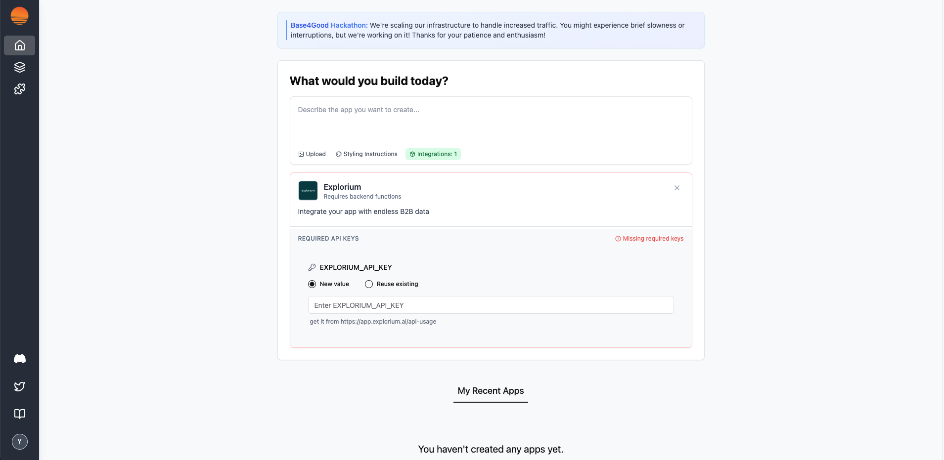 Base44 will prompt for required credentials. Select New value (or “Reuse existing” if you’ve added it before).Paste your EXPLORIUM_API_KEY.
