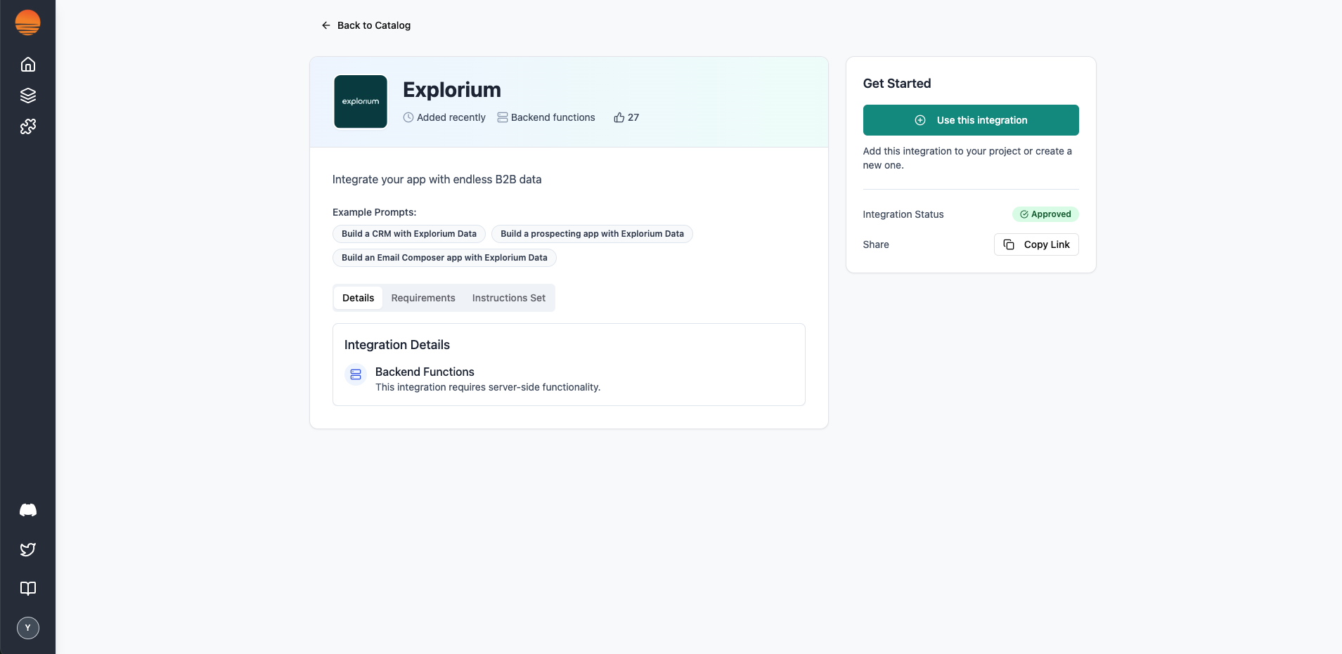 Click Explorium to open the integration detail page. You’ll see example prompts and a status badge of Approved. Hit Use this integration to drop it into your new (or existing) project.