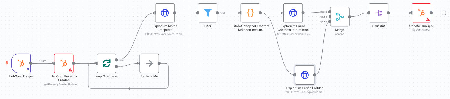 This n8n workflow monitors your HubSpot instance for newly created contacts and automatically enriches them with additional contact information. When a contact is created, the workflow:1