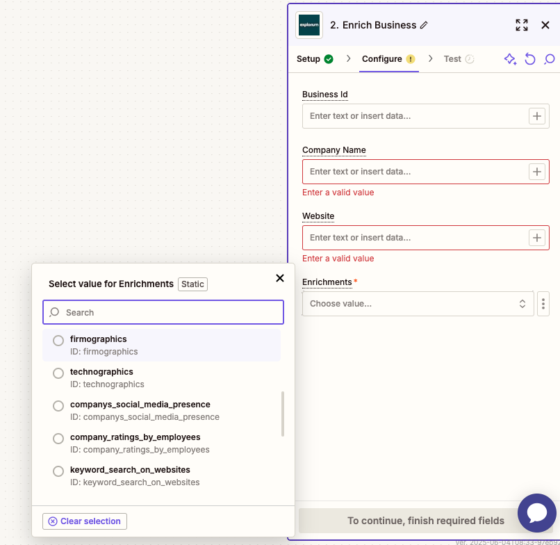 Each of the enrich actions can get either a matched id, or the same inputs as matching, if given the same inputs as matching (For example email in prospecting or company name and website in businesses) it will match before enriching, if given a matched id it will skip matching and enrich, all the fields are optional but it is required to insert at least one of the above. Each enrich action has a dropdown to choose which enrichments you want to enrich.