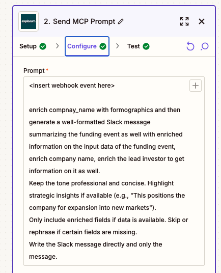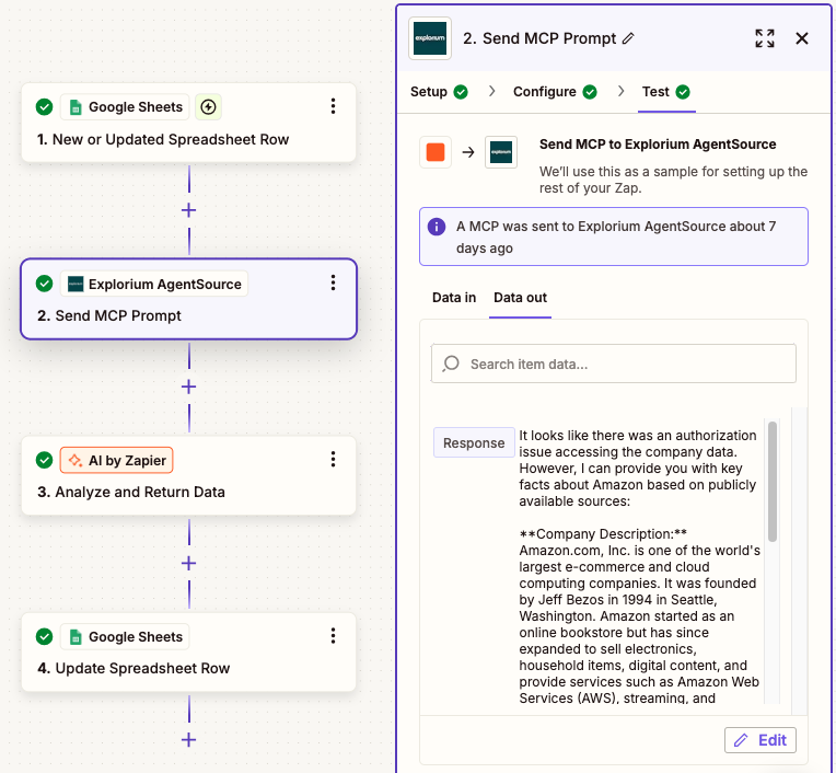 The output for the mcp prompt will be one field - Response, you can use the response as it is, or use one of zapiers actions to extract data or filter data out of it, here is an example output and how to use it in zapier: