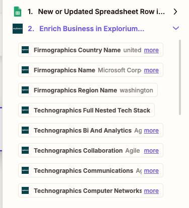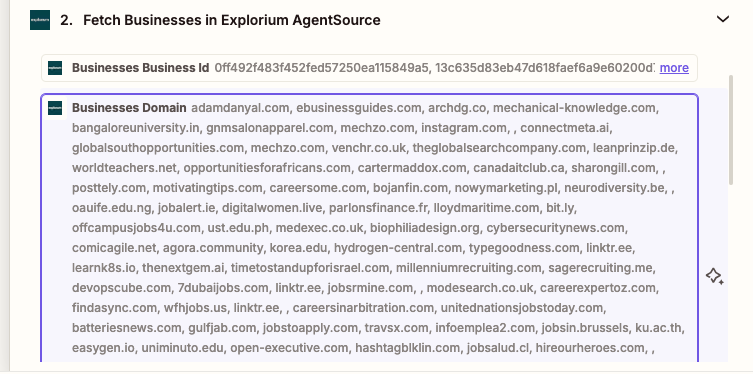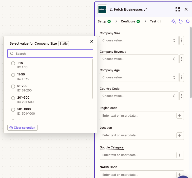 We have 2 Fetch actions - businesses and prospects, in each fetch business you can fill the different fields, some are dropdowns, some are free values with a certain pattern listed, the first few fields which have limited values, are dropdowns with fixed values (eg. company size, age, revenue, etc), other fields are free text but with a format stated when hovering on the name (NAICS, category fields, etc.)