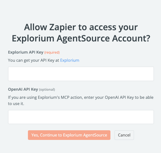 Explorium api key is required, open ai key is optional, but is necessary to use the MCP action, all the other action require only Explorium’s key.