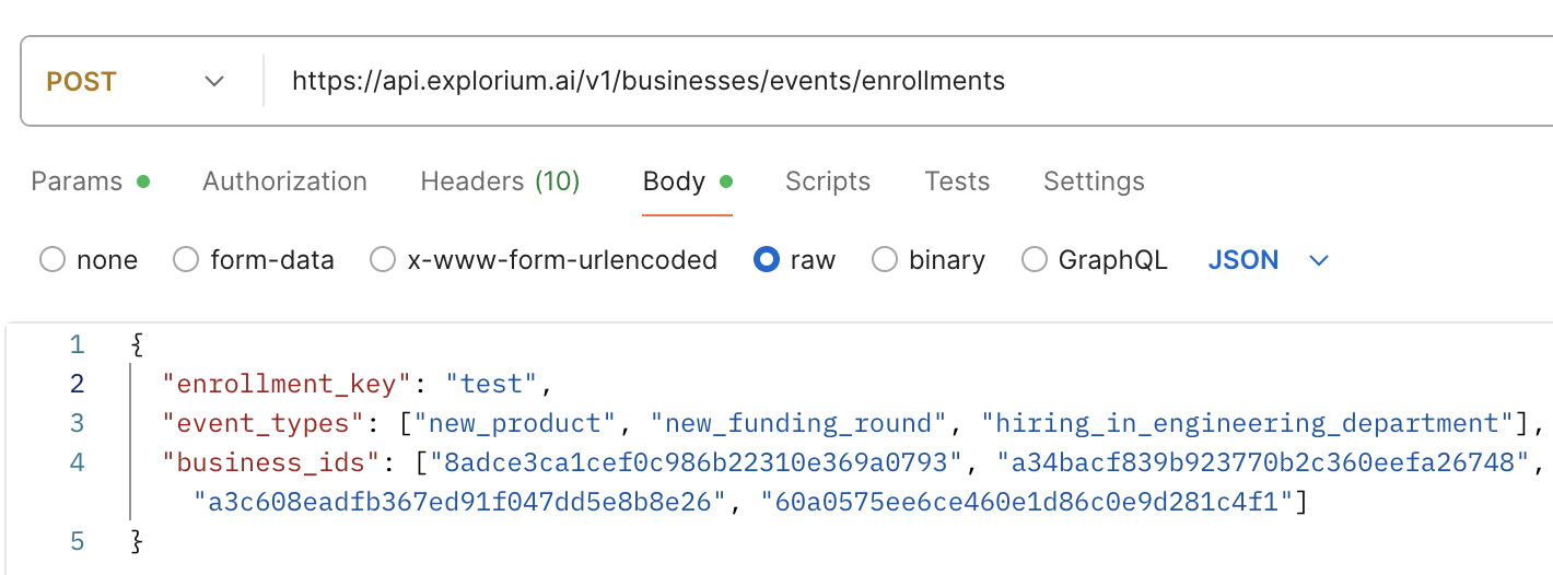 After setting up the webhook, enroll into the events you would wish to accept, this can be done with this api: /reference/businesses/events/add_businesses_enrollments Here is an example call for that endpoint: