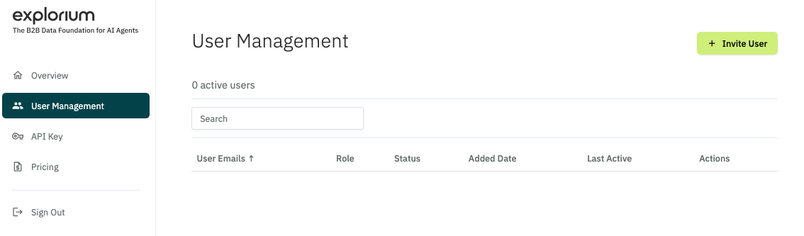 Managing users within your Explorium account ensures that the right people have the correct access levels. Admin users can invite new users, assign roles, and remove access when needed, maintaining control over API and services. Why is this important?- Ensures secure and organized access to the services.